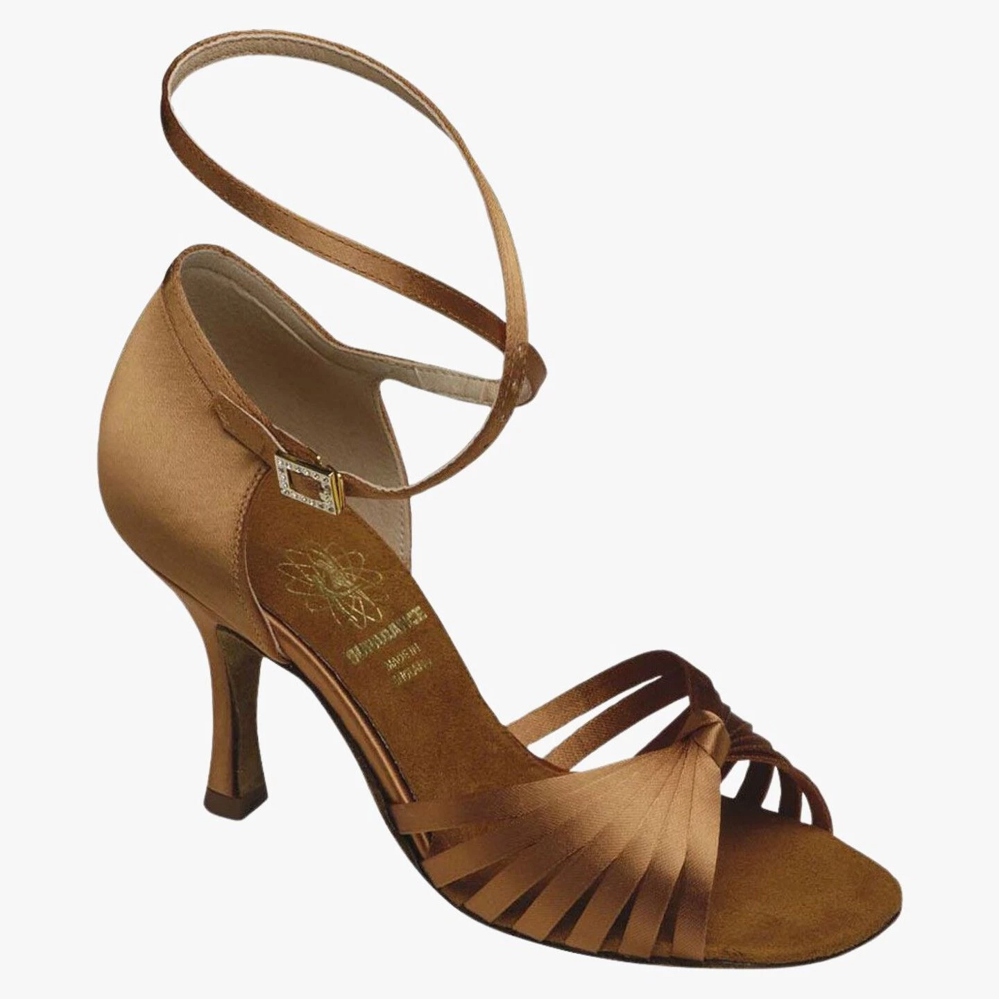 Narrow fitting Latin sandal with seven strap knotted vamp.