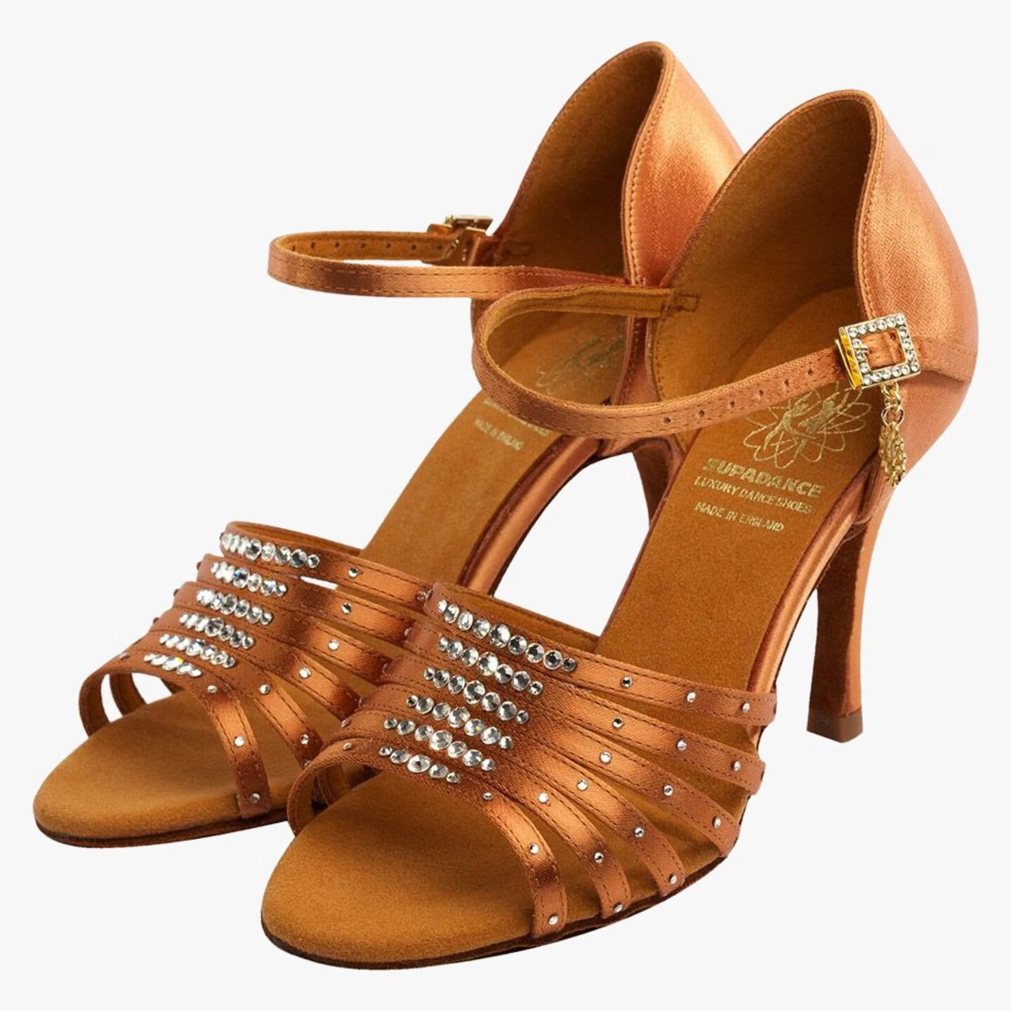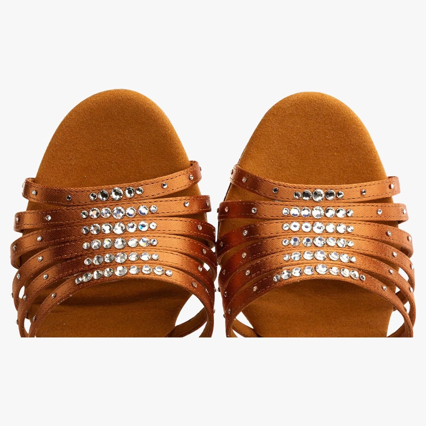 Multi strap sandal with Premium Crystal Diamantes in Dark Tan Satin.