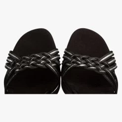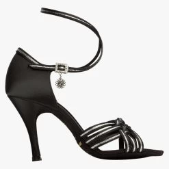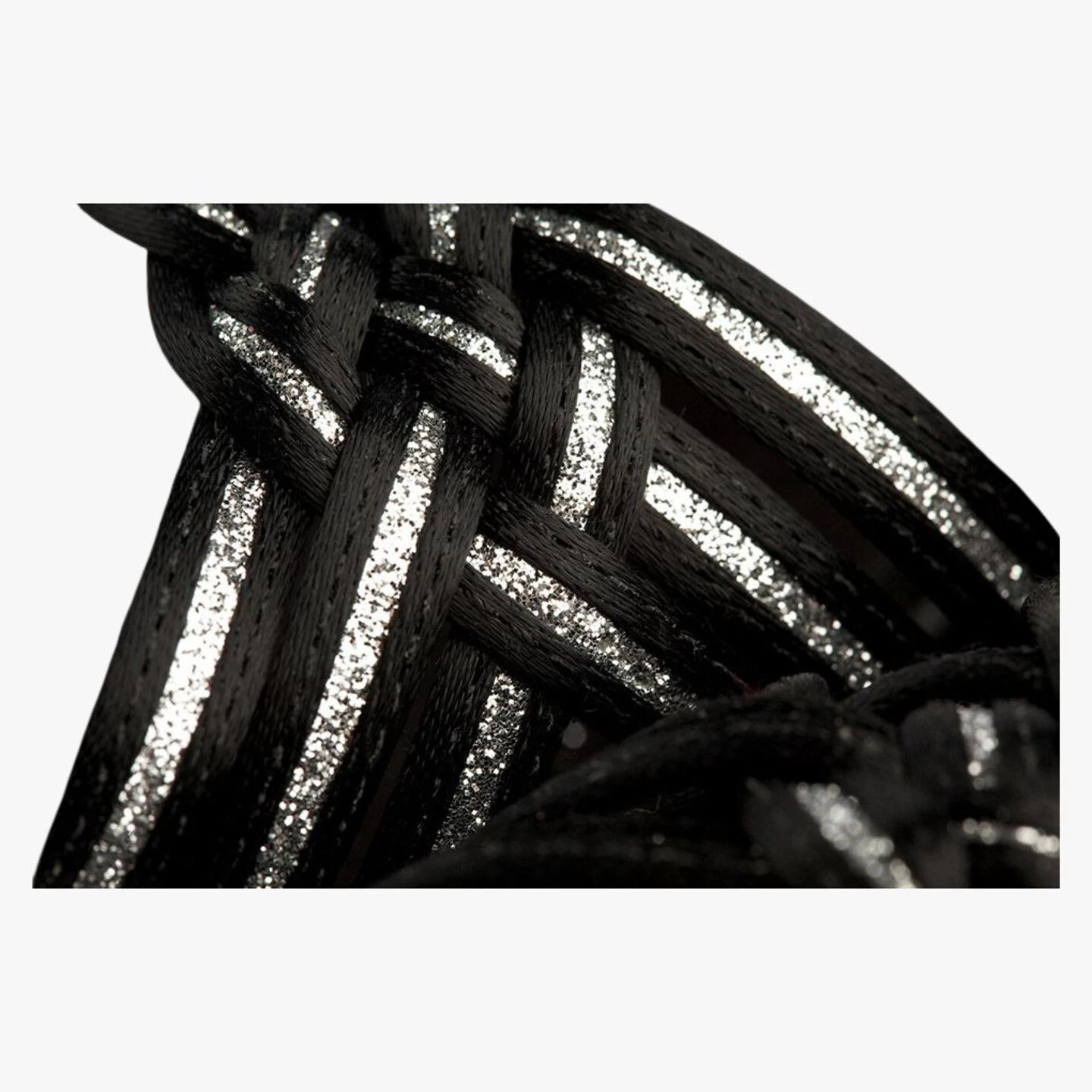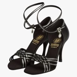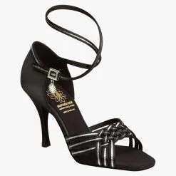 Latin Sandals in Black Satin/Silver Shimmer with a plaited front