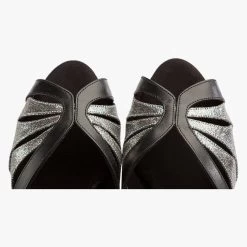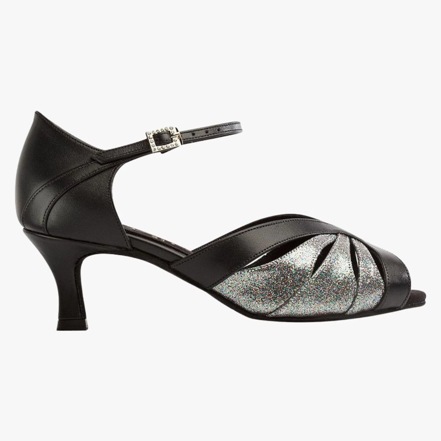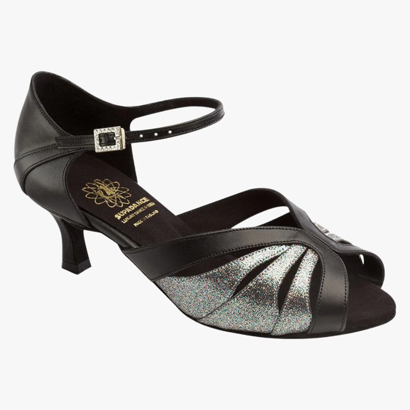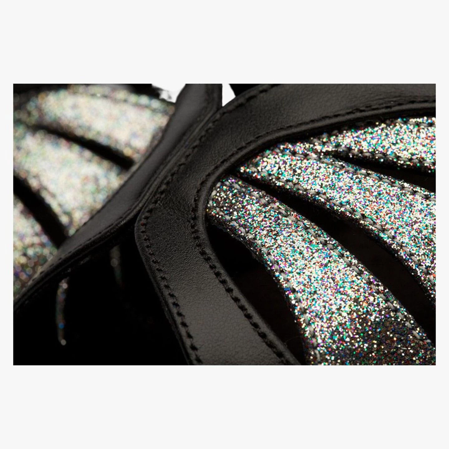 Diamante buckle and hook fastening in Black Leather / Rainbow Iris.