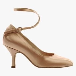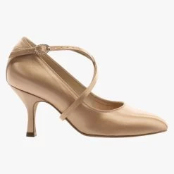 Pointed toe court shoes in Flesh Satin with traditional oval crystal buckle.