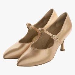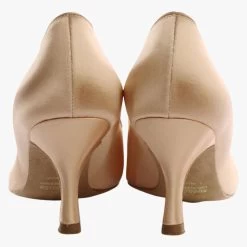 Pointed toe court shoes in Flesh Satin, oval diamante hook buckle.