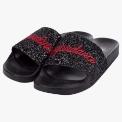 The timeless slip on design features a scalloped insole, bold embossed branding, as well as a glittered foot strap.
