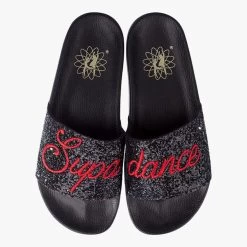 The timeless slip on design features a scalloped insole, bold embossed branding, as well as a glittered foot strap.