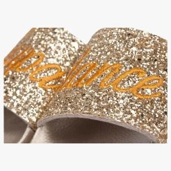 The timeless slip on design features a scalloped insole, bold embossed branding, as well as a glittered foot strap.