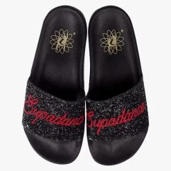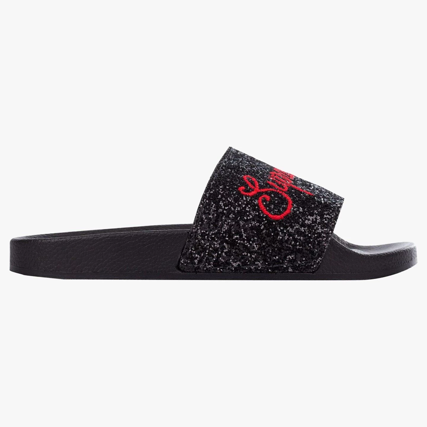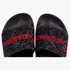 The timeless slip on design features a scalloped insole, bold embossed branding, as well as a glittered foot strap.