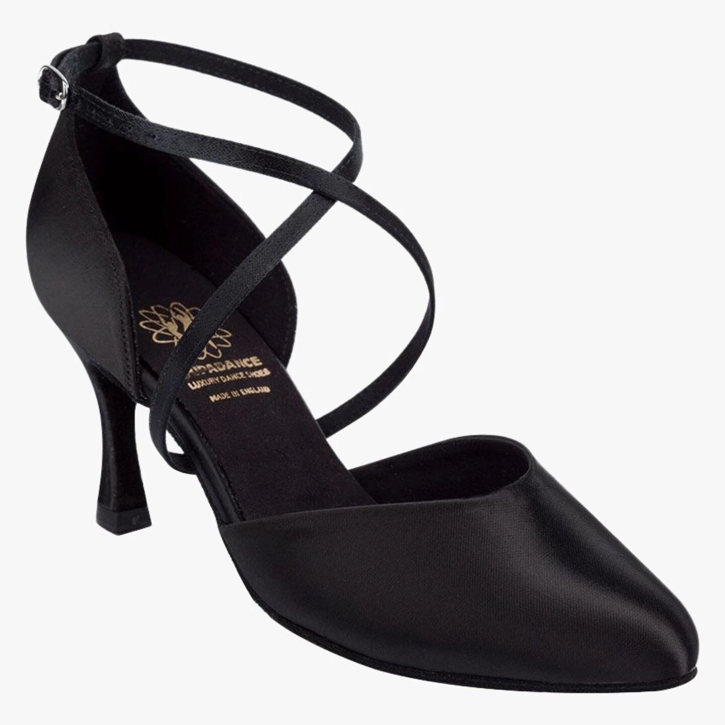 Closed toe design, made-to-order in Black Satin with 2½” Flare heel or 2″ Flare Supasole Heel.